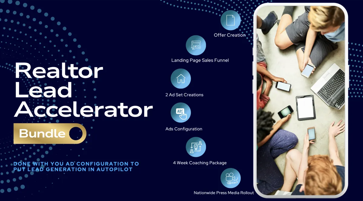 Offer creation, landing page funnel, 2 ad sets (buyer + seller), full ads configuration, 4 weeks of weekly coaching (1 hr/week), and a nationwide press media rollout.